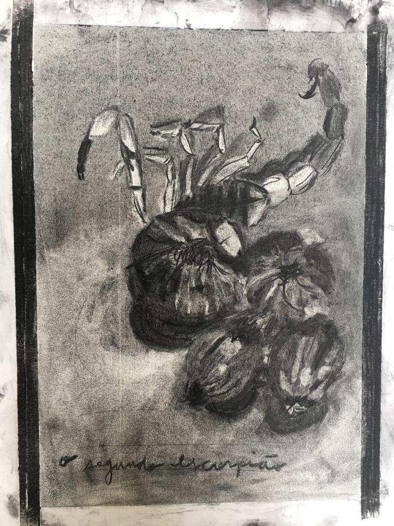 Quando nos mudamos para o urucum, a casa recém-construída do meu pai, sempre no inverno, essa sequência de escorpiões marrons continuou. Dois filhotes subindo pela parede do meu quarto. Uma família embaixo de uma tora de madeira na varanda, que dá para o jardim. Uma carcaça seca dentro do braço de um velho sofá marrom de couro (quem guarda, tem). Outro vivíssimo, à noite, de garras erguidas entre nossas pernas e a perna da mesa de jantar. Nossa filha, que então tinha três anos, quase pisou descalça em um que entrava pela porta numa manhã, já meio zonzo por causa da dedetização que acabamos fazendo, meio a contragosto porque não queríamos matar lagartixas e outros bichos não peçonhentos.